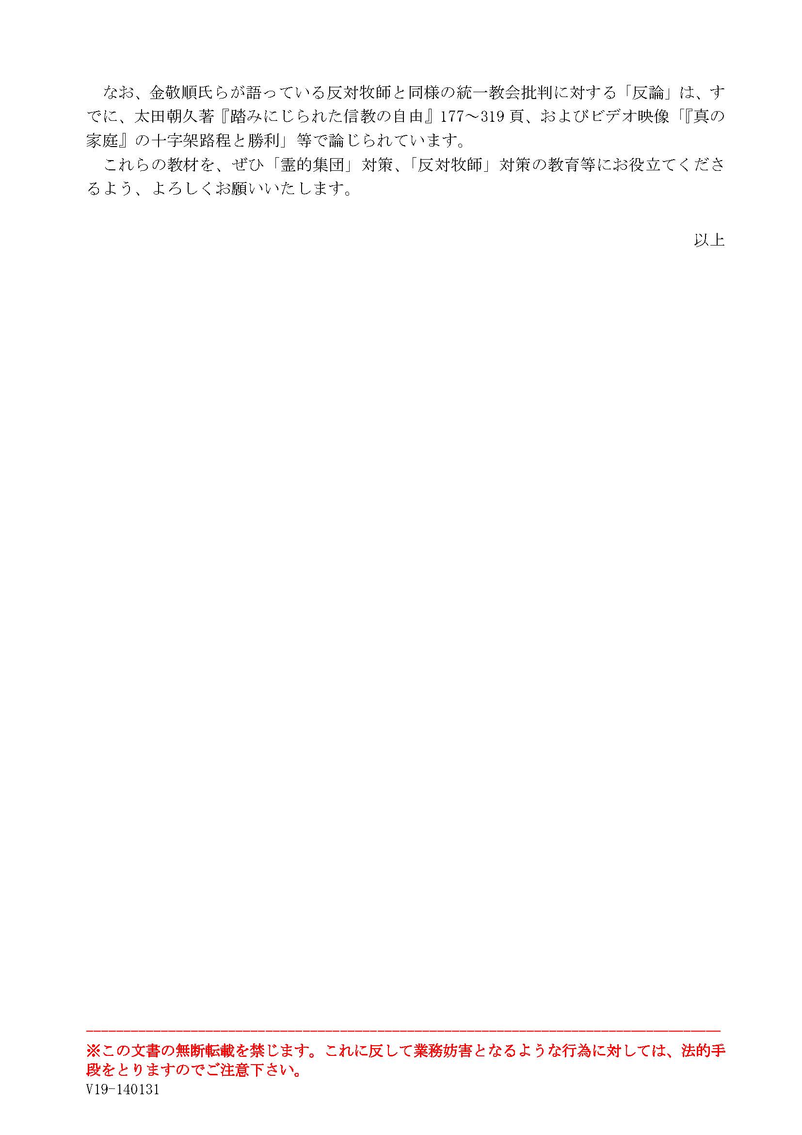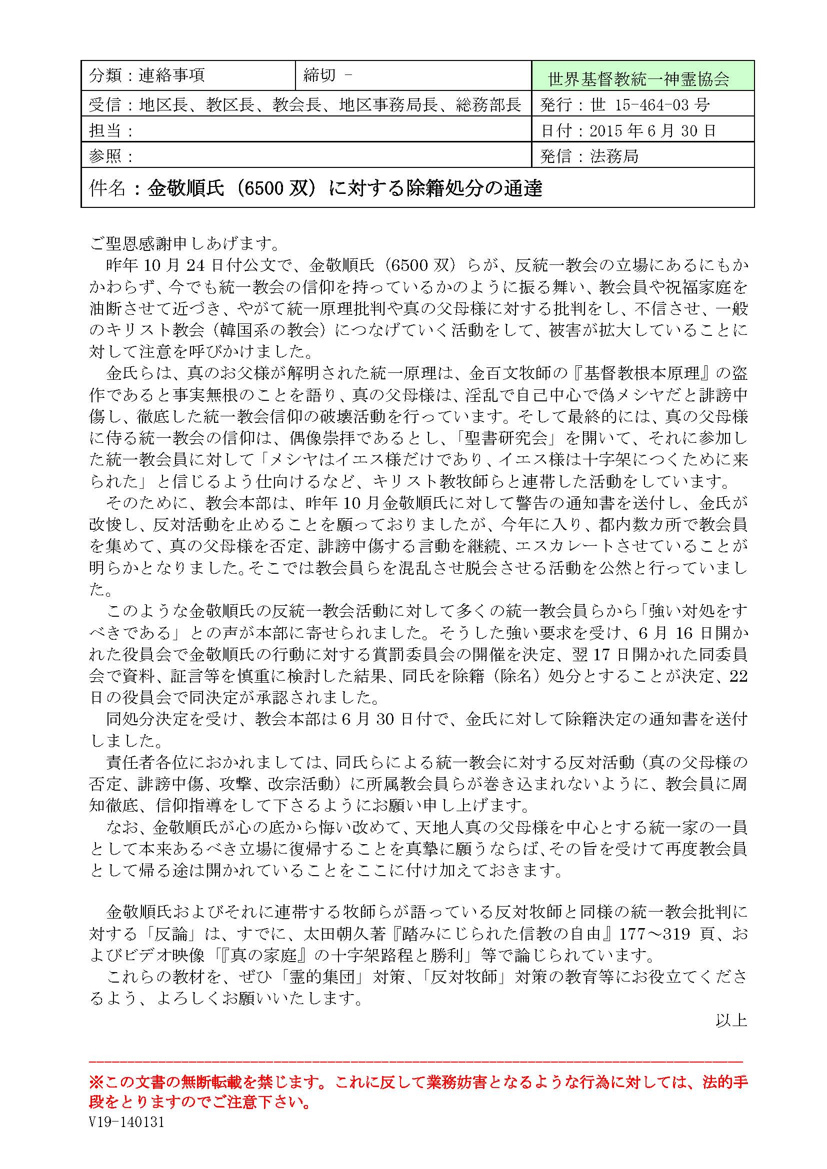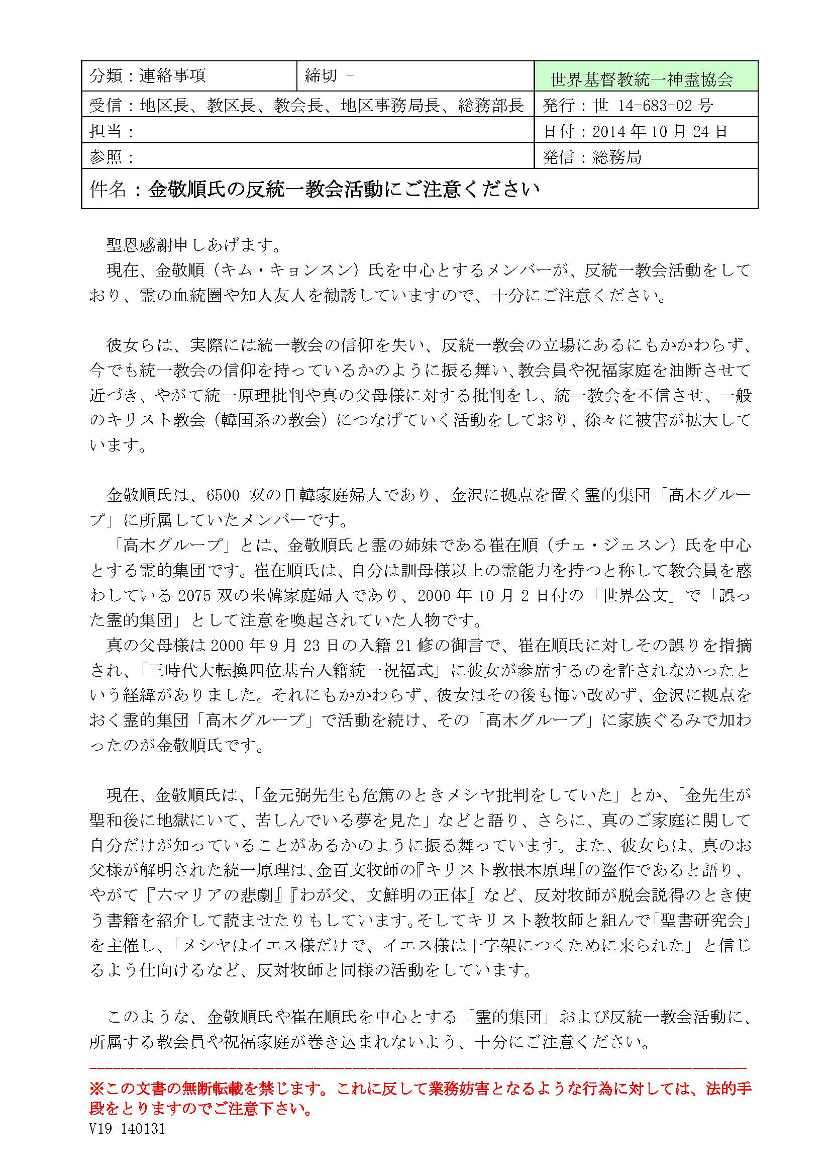 韓国本部の2000年10月2日付の「公文」は、誤った霊的集団である崔在順ら6人の名前を挙げて、以下のように注意喚起しています。